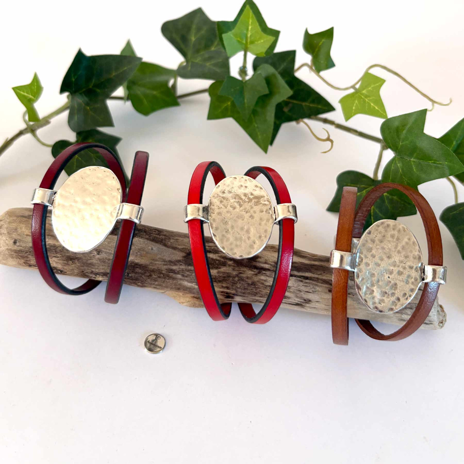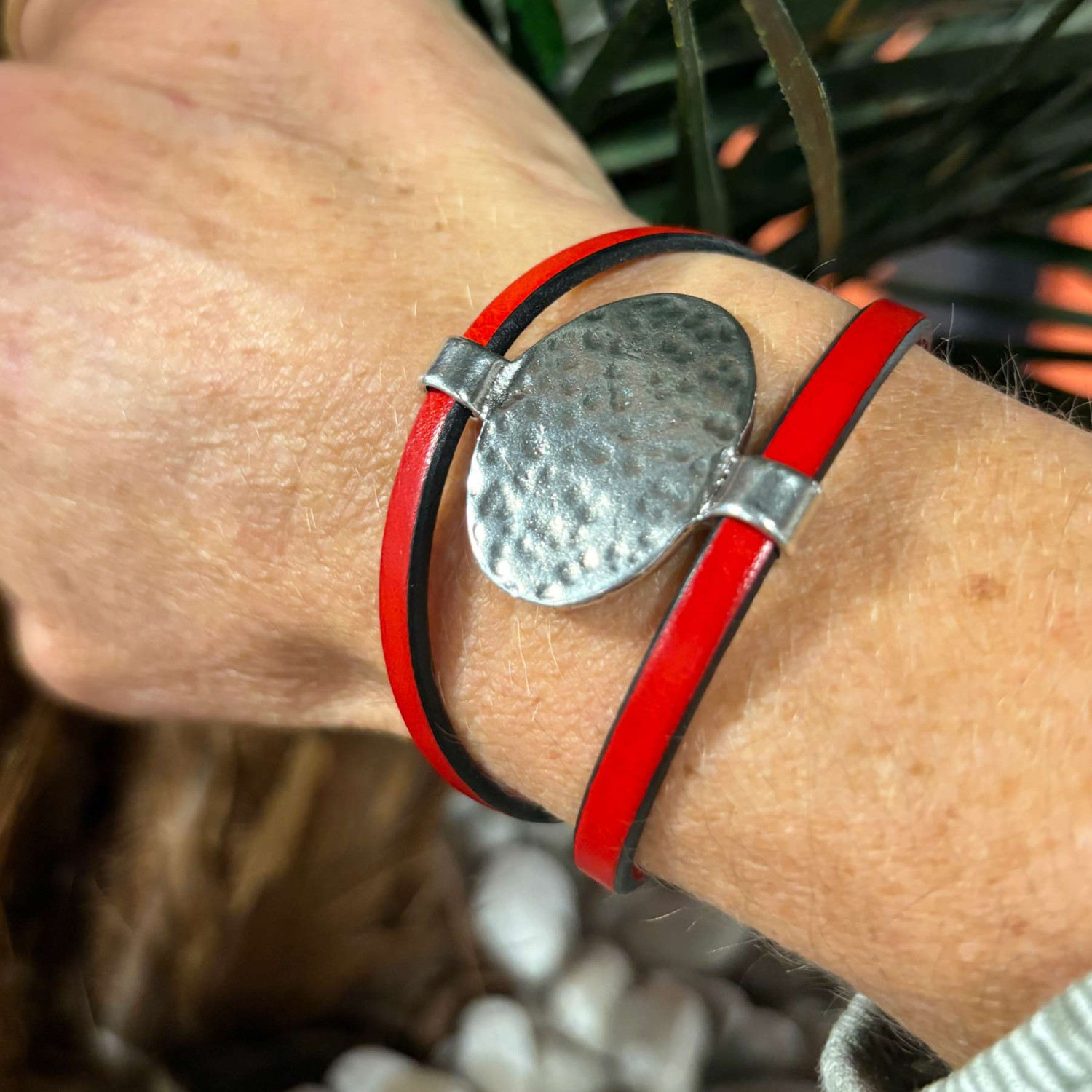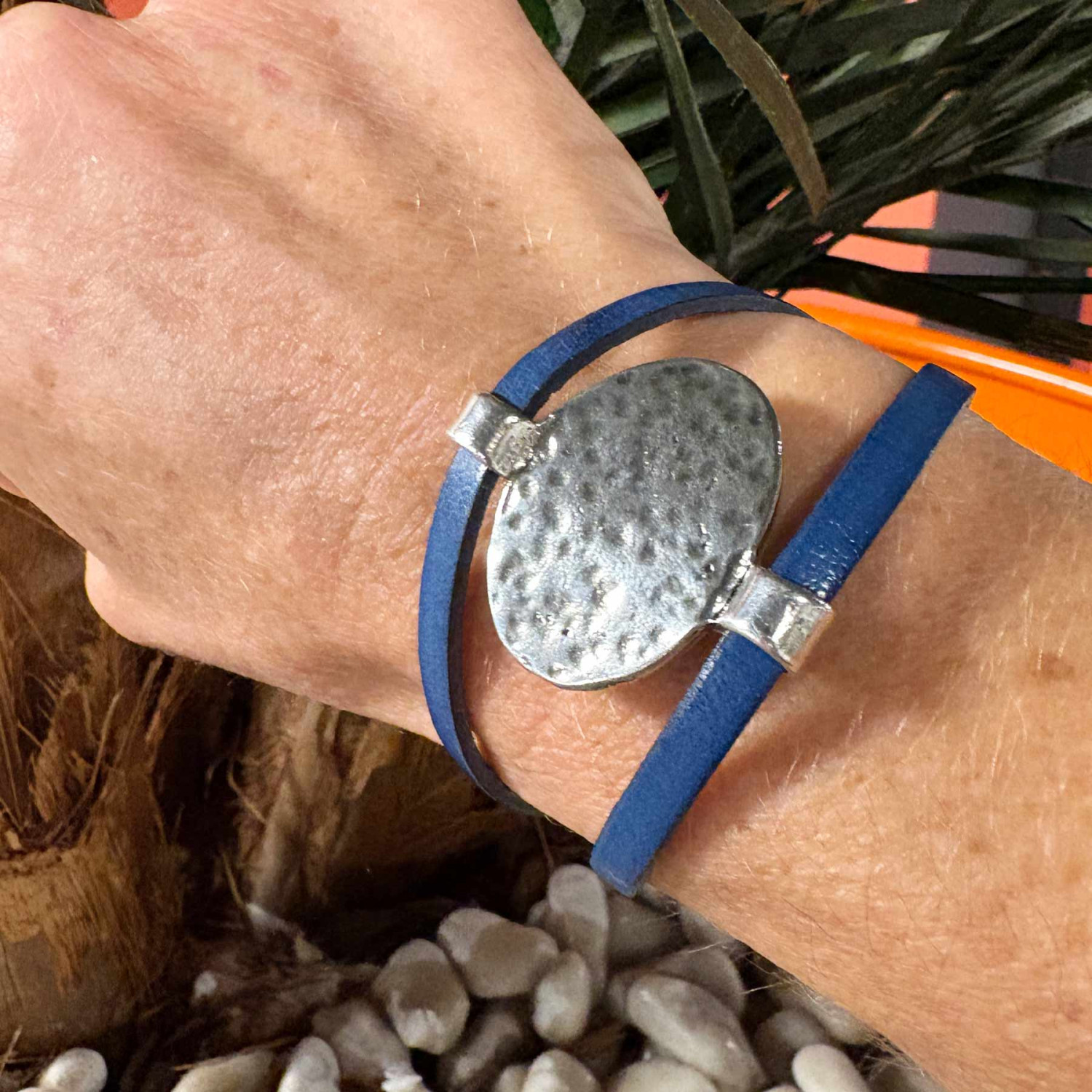 Ce bracelet en cuir pour femme allie élégance intemporelle et allure moderne. Réalisé à la main dans mon atelier de Mareil-Marly (78), il se compose de deux lanières de cuir de 5 mm rehaussées d’une pièce ovale en plaqué argent martelé (10 microns), qui capte la lumière à chaque mouvement.