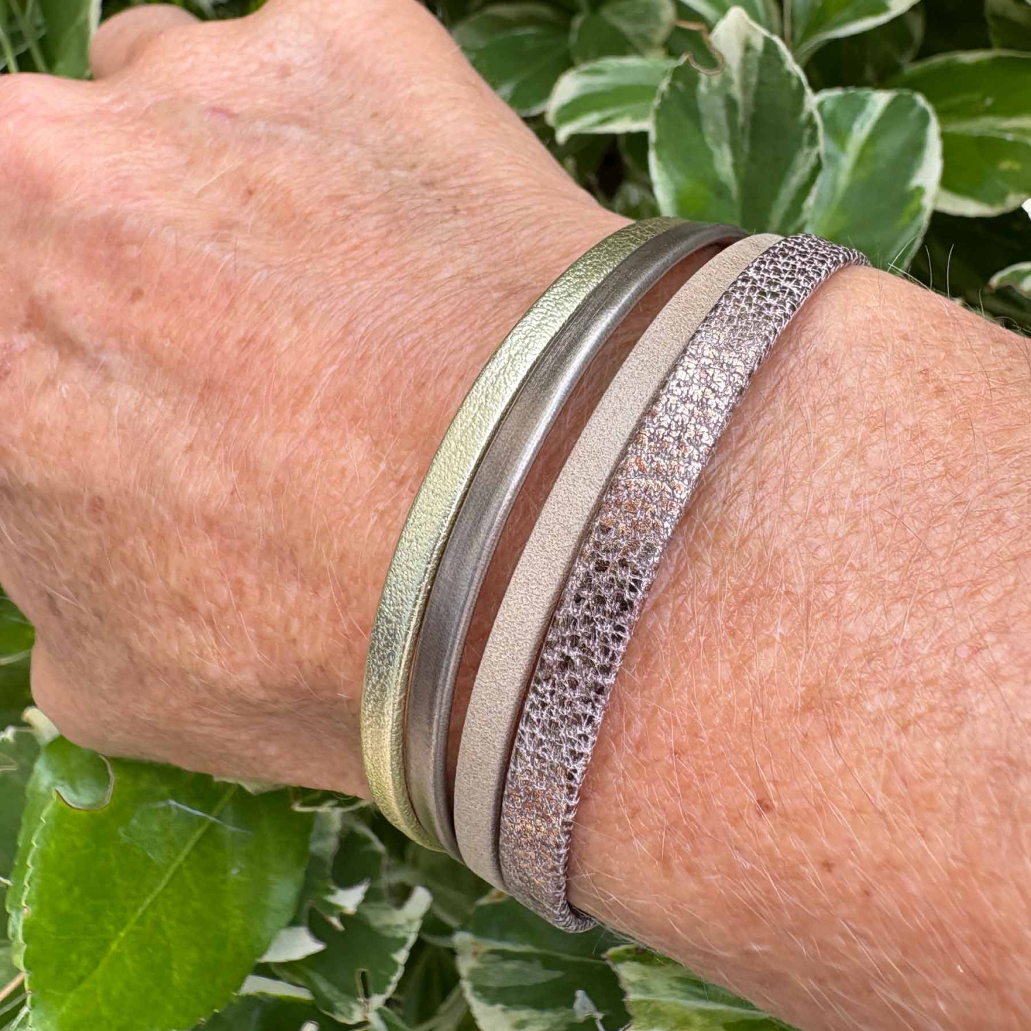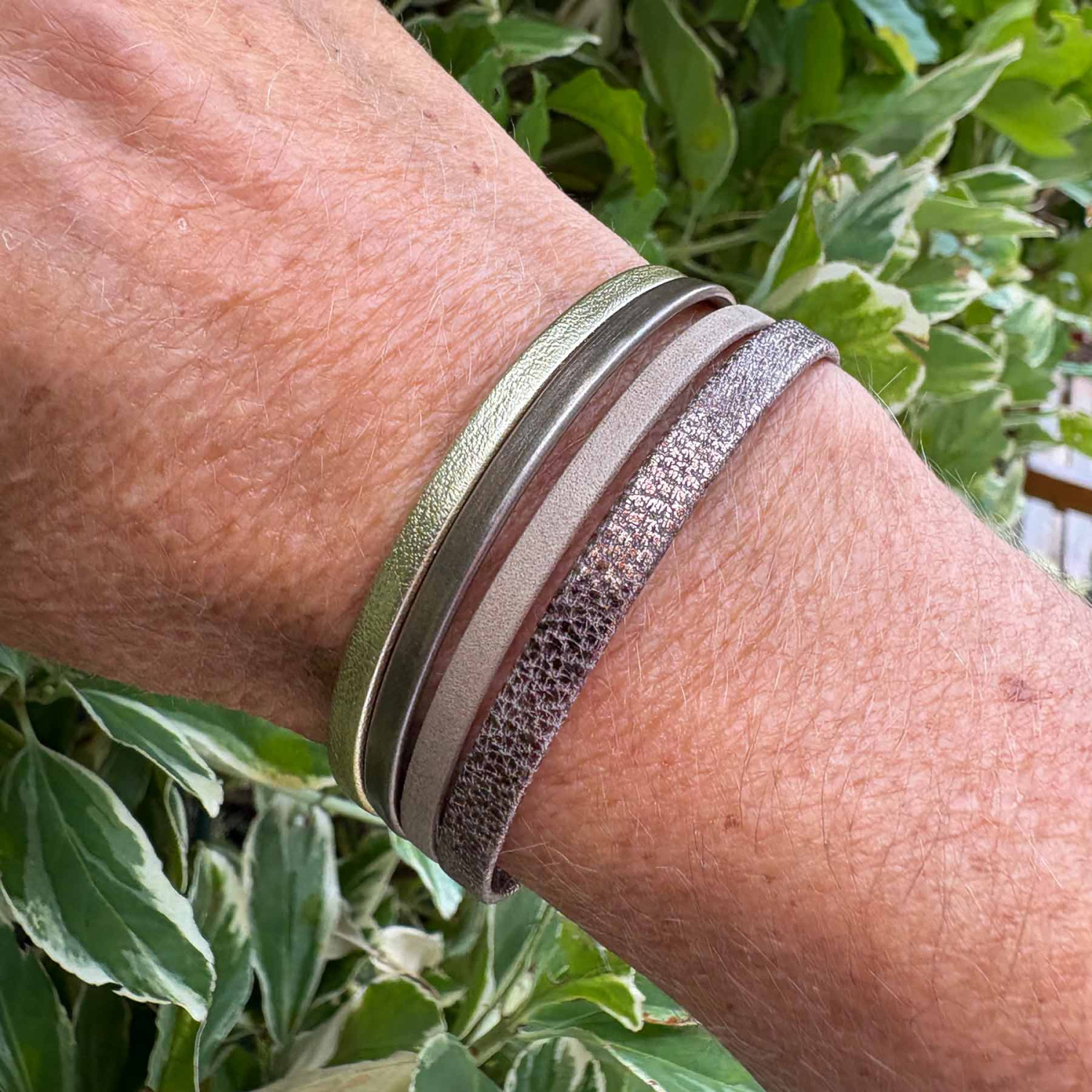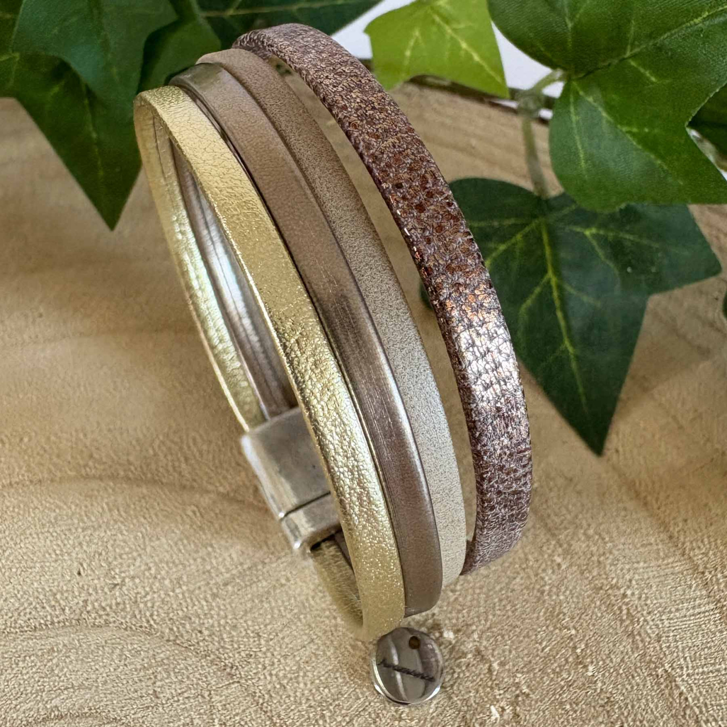 Manchette cuir femme – Entre douceur taupe et éclats métallisés