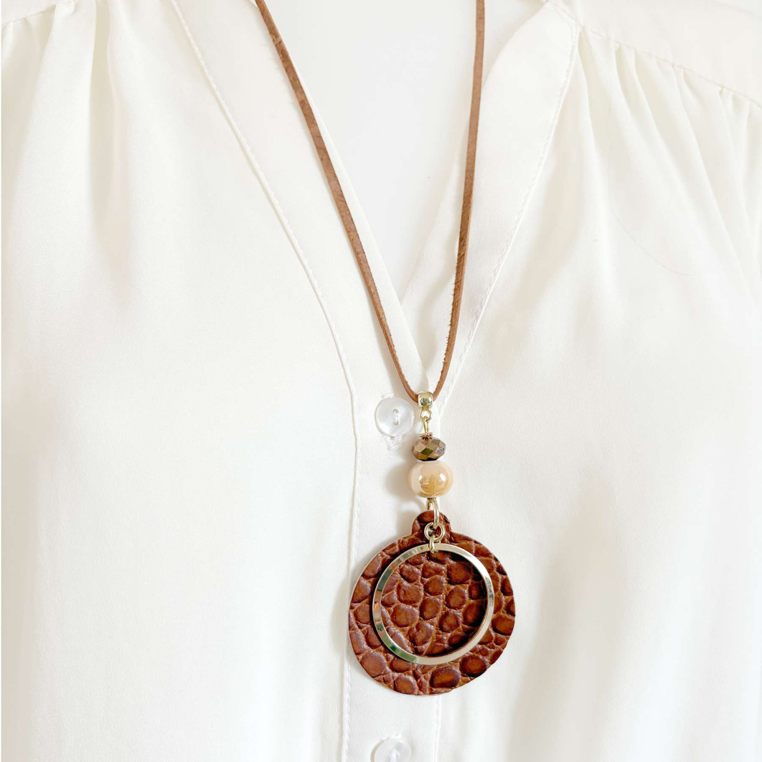 Ce collier long séduit par son grand pendentif rond en cuir texturé, surmonté d’un cercle doré qui capte la lumière et réchauffe les tons de saison. Les nuances brunes et dorées s’harmonisent avec douceur, pour un bijou à la fois élégant et authentique.